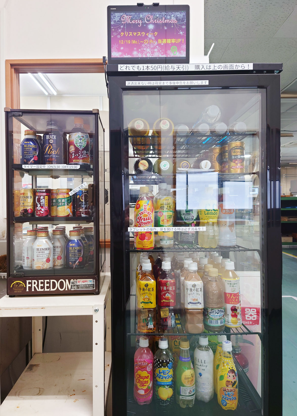 社内に設置してある自販機のドリンク類が値上げされたため1本50円で独自に社内販売を始めました。購入はタブレットから行い、翌月の給料から天引きされます。購入時の抽選で1等(50円引き)~5等(10円引き)までの当たりも!お客様の購入も可能ですので、ご来社の際はぜひご利用ください。